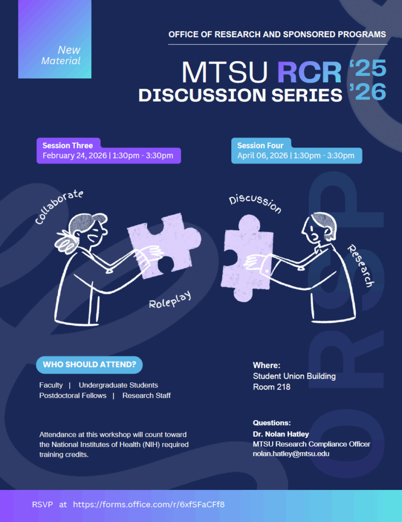 The RCR Credit Workshops will be held once a month at the Student Union and hosted by Nolan Hatley, the MTSU Research Compliance Officer. There will be a special topic in RCR each month where Nolan will present some basics on a particular topic concerning the responsible conduct of research followed by a discussion. These will be particularly valuable to those needing RCR credits, and the design of the series is to ensure on any given year, any participant can earn the required 8 contact hours required by the NIH, but may apply as credit under the NSF, USDA, and possibly NASA, the Department of Energy, and the Department of Education. These discussions will be focused on the ethics and professional responsibility of research. For reasons of academic freedom and integrity, and to encourage participation in discussion, these meetings will not be recorded, or offer remote or online participation, per the requirements of NIH.